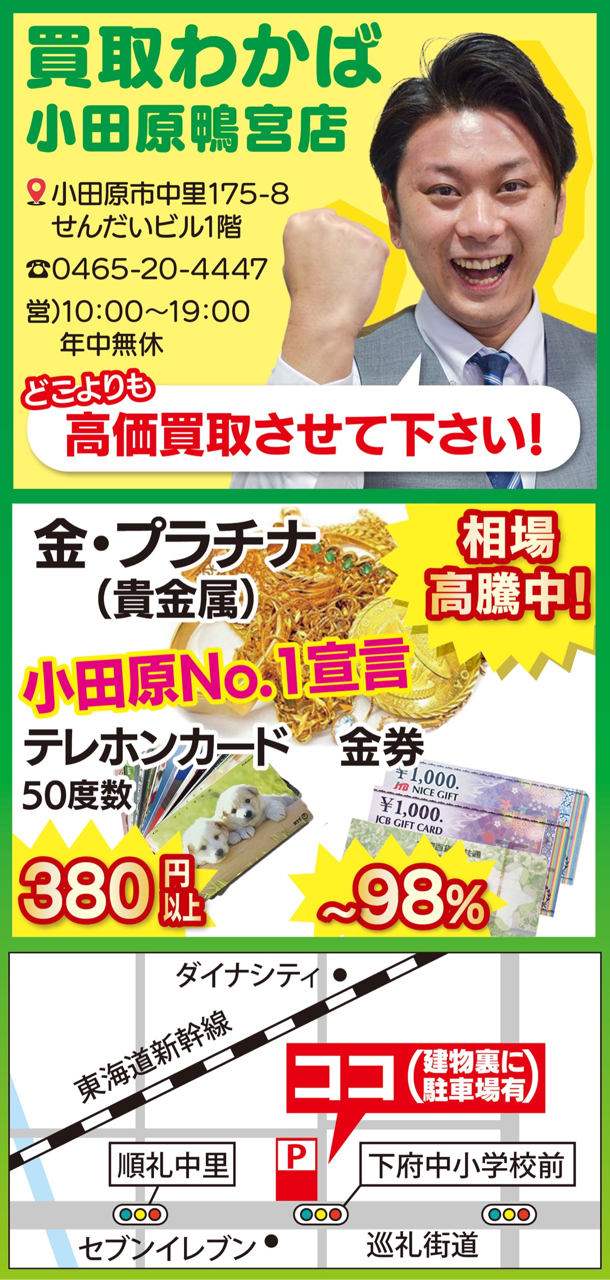 年末に向け、家の片付けを始める時期が近づいてきた。貴金属、ブランド品の価格が高騰している今が絶好の売り時。買取わかば小田原鴨宮店の前原店長は「物を売る時は、知識や販路の多いお店選びが大切かと思います」と話す。近年買取店が増える中で「金券やテレカなど分かりやすい商品の金額で見比べるのが良いのではないか」と店選びのポイントを解説。口コミ評価の高い同店に査定をしてもらっては。
