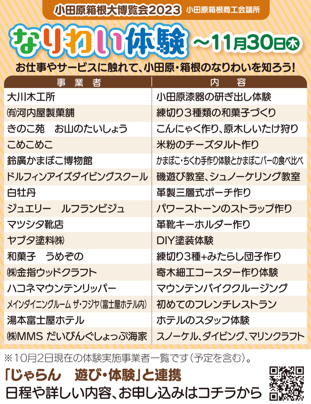 お菓子や小物づくり、寄木や漆器など伝統工芸の体験、自然に触れる体験など盛りだくさん。詳しくは小田原箱根大博覧会HPで随時発信中。申し込みはネット「じゃらん 遊び体験」から。