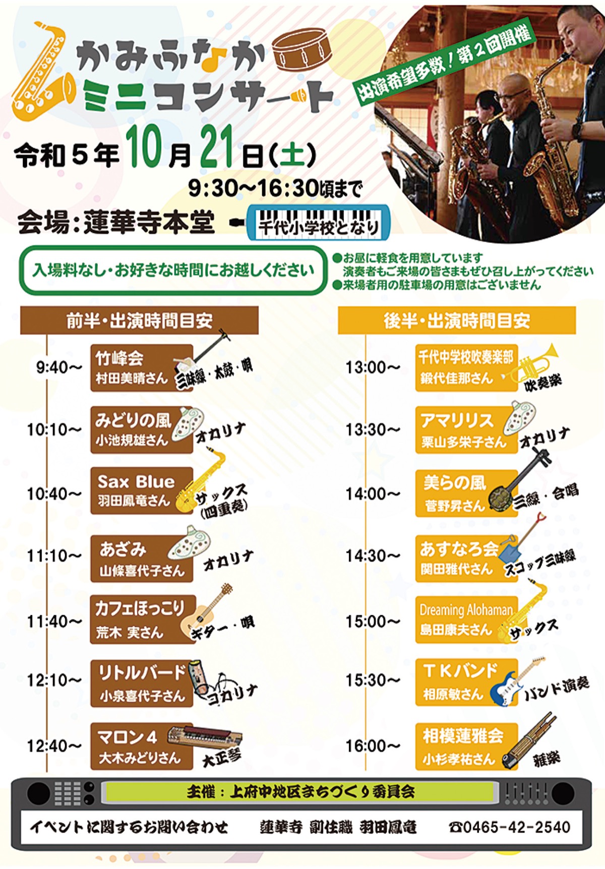 上府中地区まちづくり委員会が10月21日(土)、蓮華寺(小田原市千代815の1)で「かみふなかミニコンサート」を行う。入場無料。