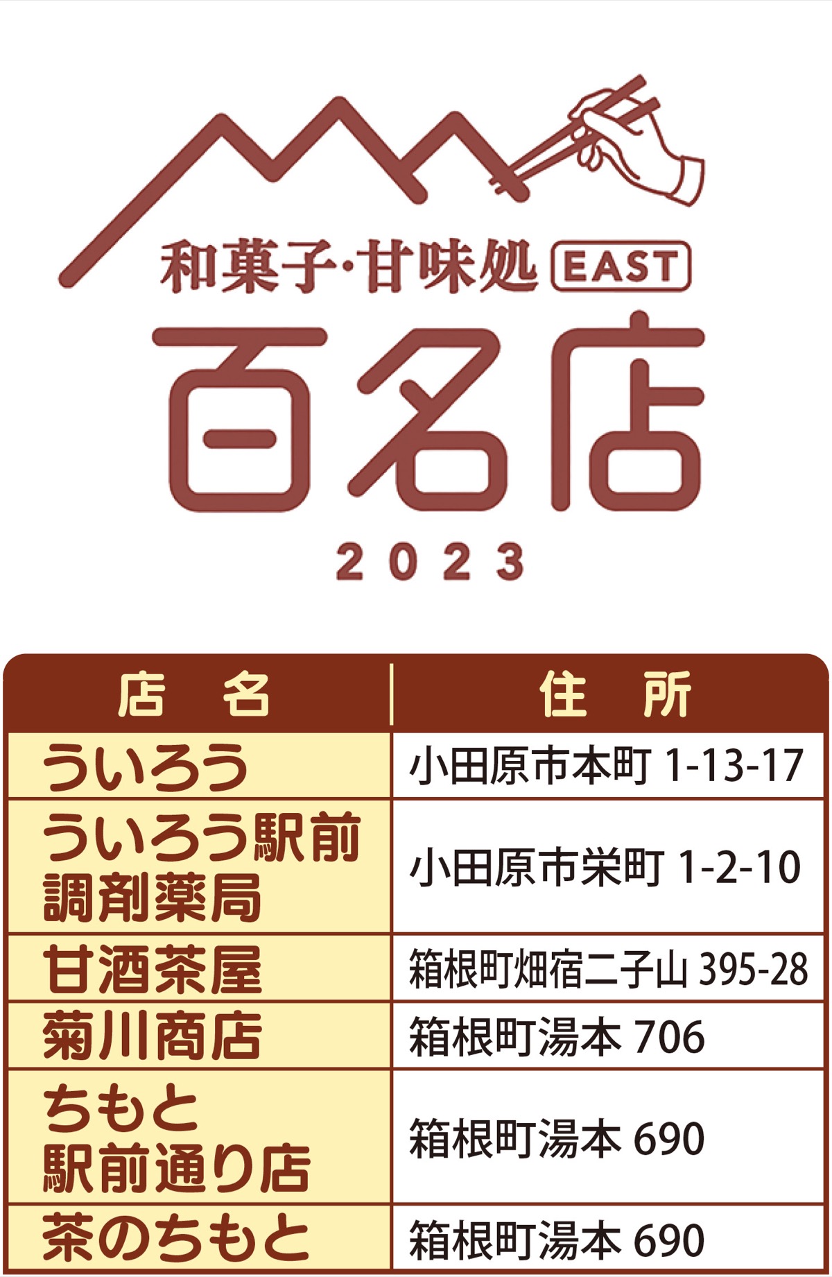 EASTの100店のうち神奈川県は20店。その中で県西エリアでは小田原市から「ういろう」「ういろう駅前調剤薬局」の2店、箱根町からは「甘酒茶屋」「菊川商店」「ちもと駅前通り店」「茶のちもと」の4店が選ばれた。