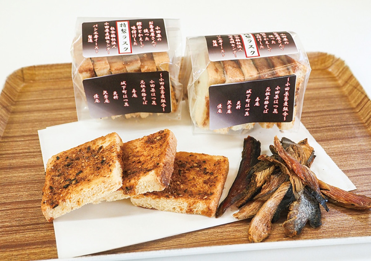 小田原そば商組合(大垣徹晃組合長)がこのほど、社会福祉法人小田原支援センターが運営する「パン工房 イースト」(小田原市東町)とコラボレーションした特製ラスクを発表した。