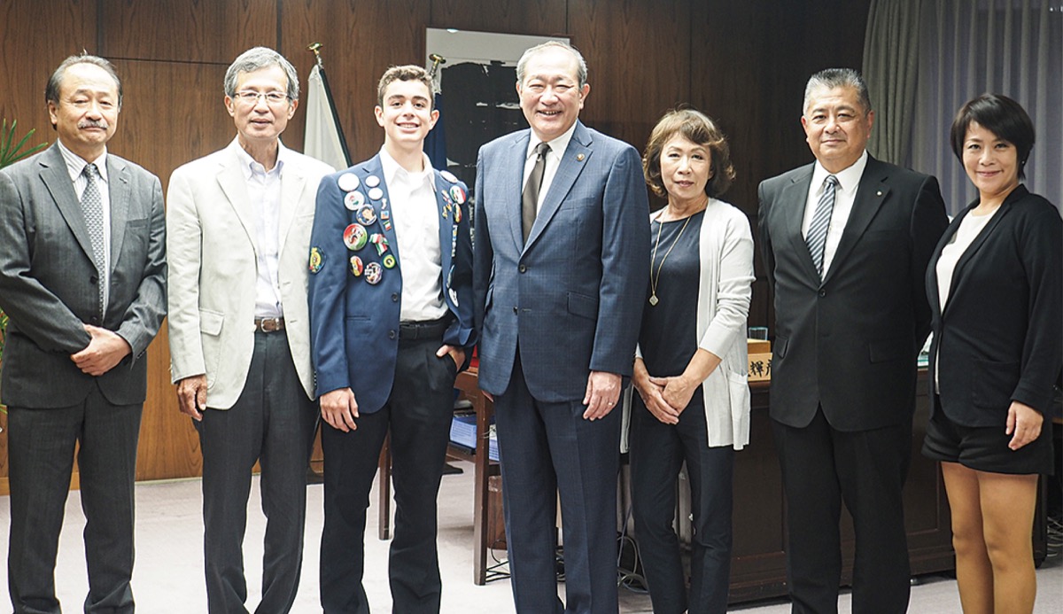 小田原城北ロータリークラブ(荻野善明会長)の交換留学生パトリシオ・ロドリゲス・ムニョスさん(15歳)が10月5日、ロータリークラブのメンバーらと守屋輝彦小田原市長を表敬訪問した。