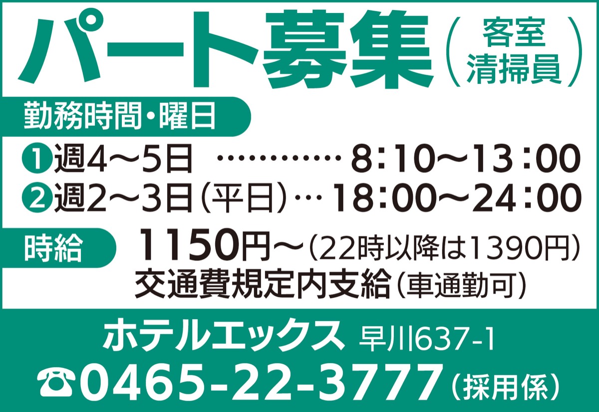 箱根板橋駅から徒歩11分のホテルエックスでは客室清掃を担当するスタッフを募集している。「近隣の方大歓迎です。親切丁寧に指導します」と応募を呼び掛けている。応募は電話から。(問)同ホテル採用係【電話】0465・22・3777