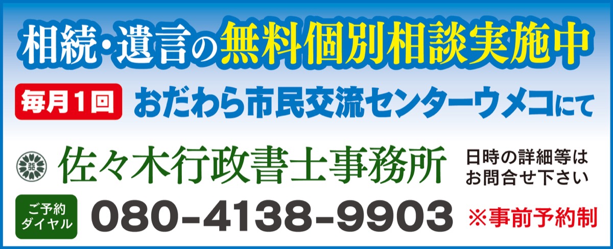 相続や遺言、空家問題等、これまで1800件余りの相談を受けてきた佐々木行政書士が、小田原駅東口から徒歩約1分のおだわら市民交流センターウメコで毎月、無料個別相談を実施している。電話で要予約、出張相談にも対応可能。弁護士、司法書士、税理士と業務提携しているため全ての問題に対応できる。