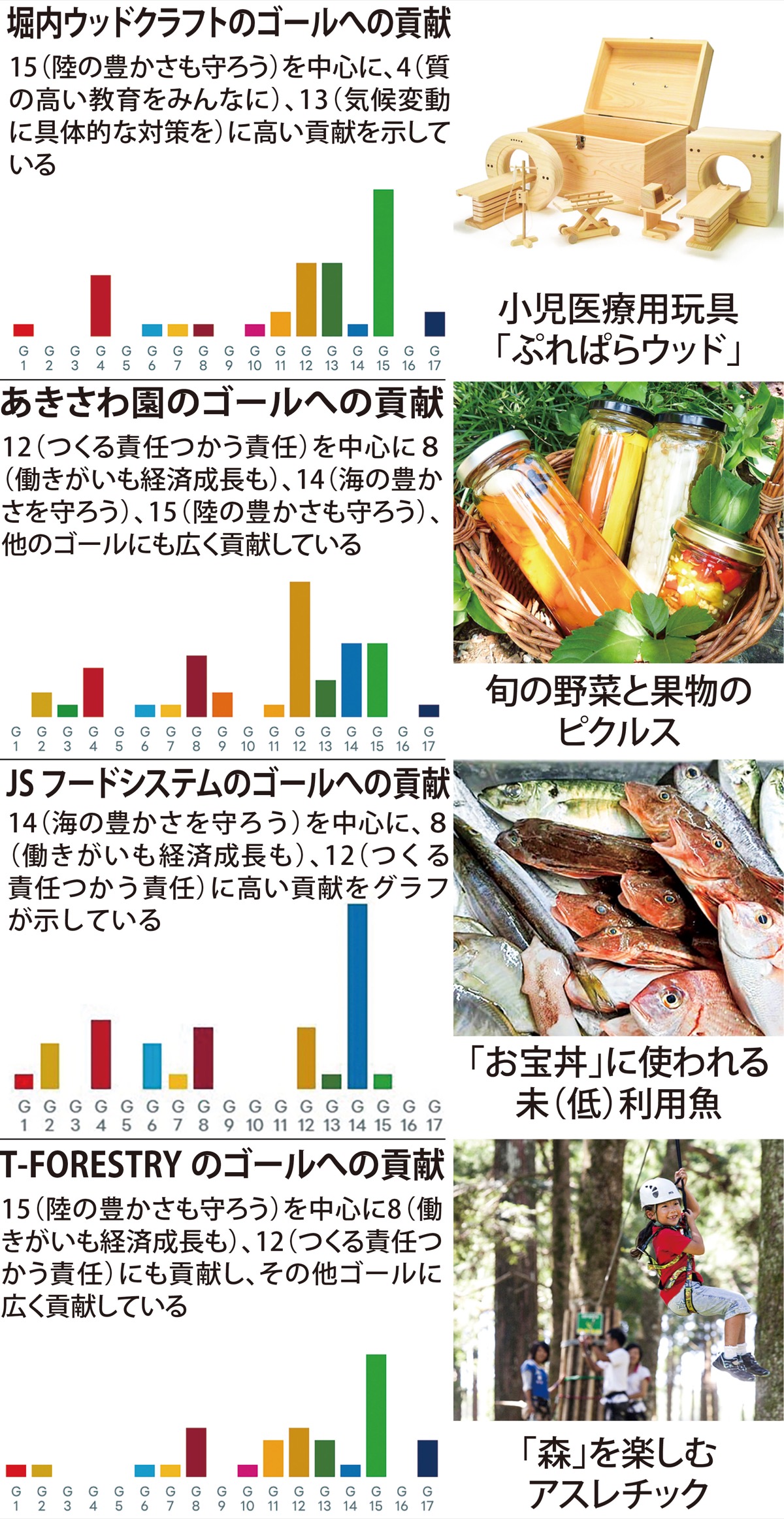 特徴のひとつが、企業や個人の活動を独自開発したプログラムでSDGsの17のゴール別にグラフに分け「面白く見える化できる」こと。「企業PRはもとより、従業員にも自社の取組が理解しやすくなる」という。