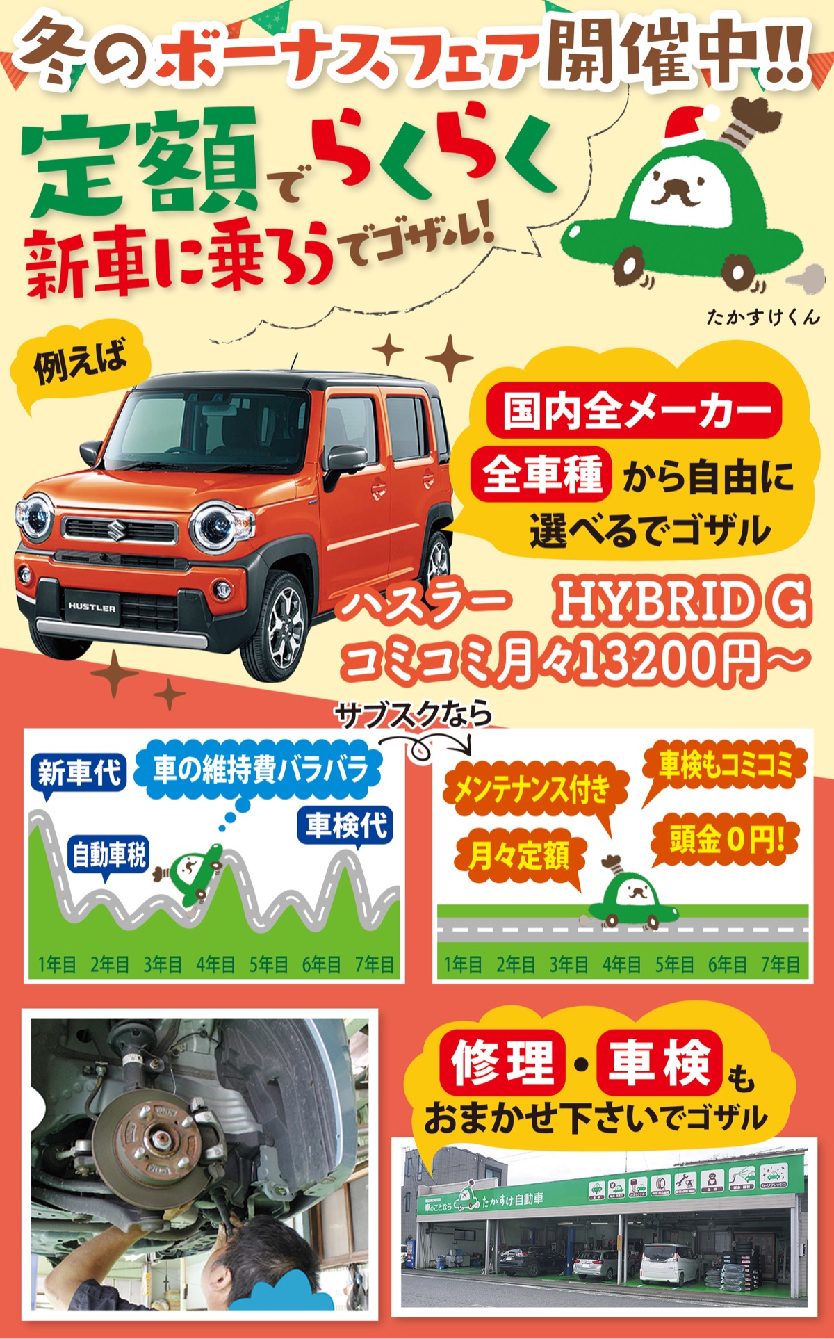 「たかすけ自動車」では冬のボーナスフェアを開催中。「新型スペーシア」など人気車種も続々登場中だ。