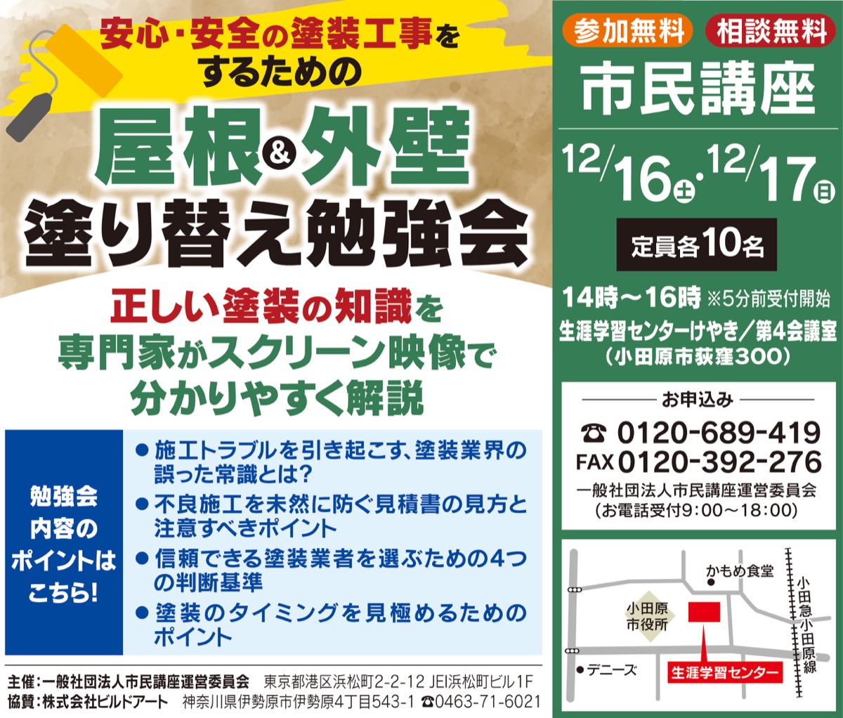 外壁塗装で多くの実績を誇る、創業15年の株式会社ビルドアートが協賛する塗装講座が12月16日(土)と17日(日)、小田原市生涯学習センターけやき(荻窪300)の第4会議室で開催される。午後2時〜4時。(5分前受付開始)。参加無料・相談無料。定員各10人。