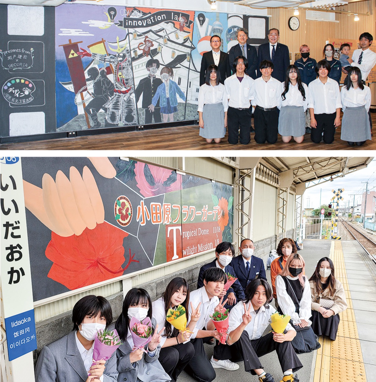 大雄山線飯田岡駅ホームではデコリアと小田原フラワーガーデン、大雄山線管理所協力で2020年から毎年実施。同ガーデンで1月8日(月)まで開催しているイベントをPRする看板で、リーダーの青木心愛さん(3年)は「駅のホームで待つ方も電車の中から見る方にも分かりやすいように制作した」と話した。