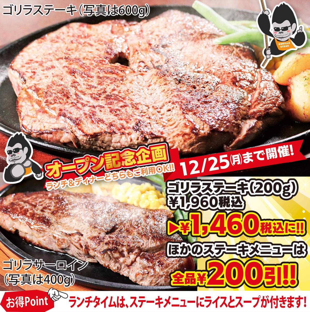 「ゴリラステーキ」で12月25日(月)まで(要紙面持参)
