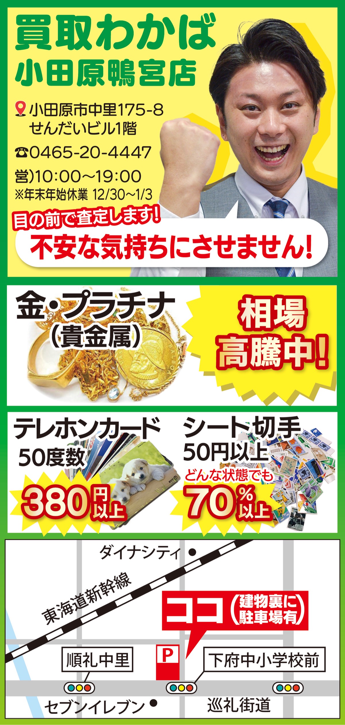 年の瀬が押し迫ってきた。「今年は金の高騰が話題になりましたね」と買取わかば小田原鴨宮店の前原店長は振り返る。「年内に金を高値で売って清々しい気持ちで新年を迎えましょう。売り時に悩んでいる人は今しかありません」と念を押す。大好評のテレカ50度数380円以上、シート切手50円以上70%以上での買取りも継続中。不要品を年内に綺麗にしたい人は品物をまとめて前原店長に相談してみては。