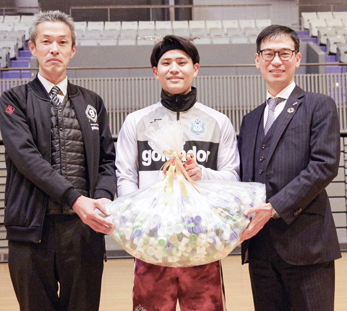 湘南ベルマーレフットサルクラブと地域の課題解決に向け連携するみずほ銀行小田原支店と日本郵便が先ごろ、環境保全の取り組みとして同チームにペットボトルのキャップを届けた。チームでは昨年、小田原市のごみ分別をPRする”キャップ”テンとして中澤航選手が就任しており、みずほ銀行の清水正治小田原支店長、山北岸郵便局の尾崎剛局長が同選手へ職場などで回収されたキャップを届けた。