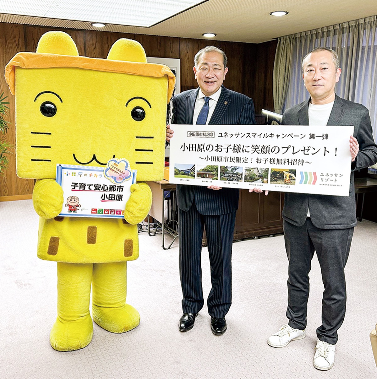12月15日には守屋輝彦小田原市長を訪問し目録を贈呈した。同園の担当者は「昨年7月にリニューアルオープンした施設に地域のお子様たちを迎えて、笑顔と笑い声が溢れる一日を過ごしていただければ」と話す。また同キャンペーンを県内の他市町村にも広げる方針で「地元に還元できれば」としている。(問)箱根小涌園ユネッサン【電話】0460・82・4126