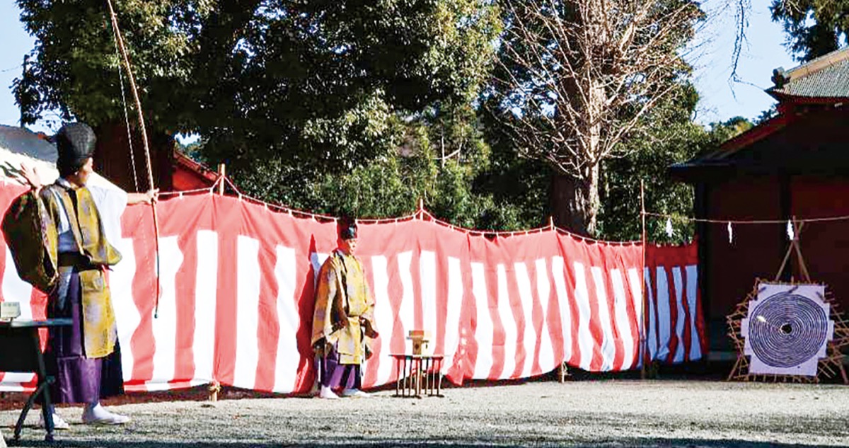 当日は狩衣姿の2人の射手が宮司からおはらいを受けた後、境内の竹で作られた弓で7本の矢を的に向けて放ち、命中した本数によって吉凶を決める。最後の一矢が射られた後、幸運に恵まれるといわれる、的につるされた「鳥形(つばめ)」を観衆(小学生以下)が取り合う。昨年は7本中5本が命中し、吉凶は『吉』だった。(問)同神社【電話】0465・43・0093