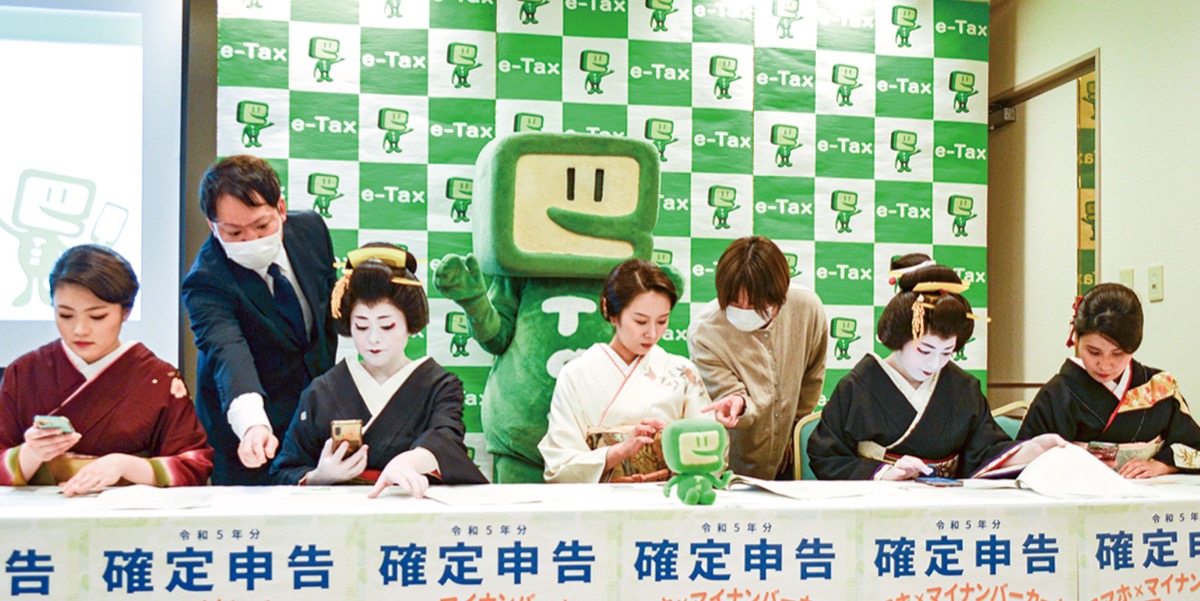 5人の芸者は税務署職員のサポートを受けながら、医療費控除の入力やスマートフォンのカメラで給与所得の源泉徴収票を読み取るなど行った。同税務署によると昨年度の全国利用率は65・7%で、その内スマートフォンを使って申請した人は約4割と増加している。