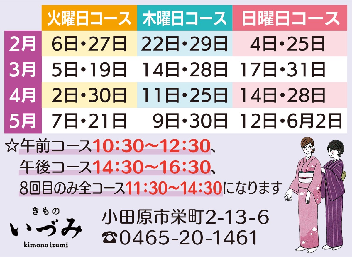 小田原市栄町2丁目にある呉服屋「いづみ」で毎回好評の初心者向け着付け教室が2月から開催される。1〜7回目は各2時間、8回目は3時間で全8回合計17時間。受講料は無料。着物や小物を持っていなくても、レンタルパックの用意もあるので安心。受講の申し込みは【電話】0465・20・1461。