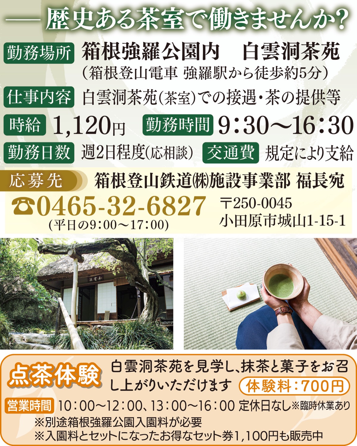 箱根強羅公園は、園内の茶室「白雲洞茶苑」で接遇や茶の提供などを行う茶道経験のある従業員を募集している。白雲洞茶苑は、100年以上の歴史ある国指定文化財の茶室。「点茶体験」は気軽に日本文化を体験でき注目されている。ブランクがある人も大歓迎。応募先は箱根登山鉄道(株)。電話のうえ、履歴書(写真貼付)を送付する。