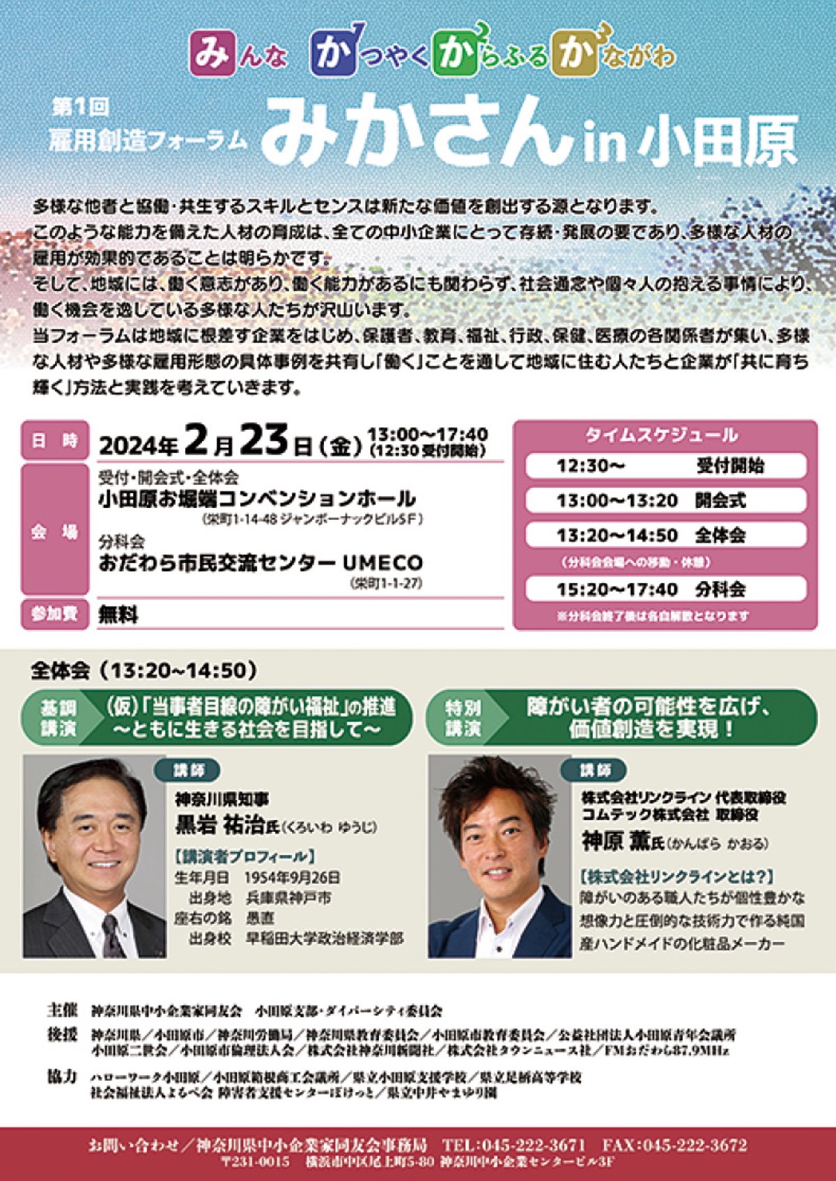 開会式・全体会/小田原お堀端コンベンションホールで午後1時から開会式。1時20分から黒岩祐治県知事が基調講演「(仮)当事者目線の障がい福祉」、神原薫(株)リンクライン代表取締役が特別講演「障がい者の可能性を広げ、価値創造を実現!」を行う。分科会/市民交流センターUMECOで3時20分から【1】「インクルーシブデザインってなに?」、【2】「障害当事者の就労実例の紹介」、【3】「ロールプレイで学ぶ障害者雇用」、【4】「多様な人材戦略で人材確保!」がテーマ。
