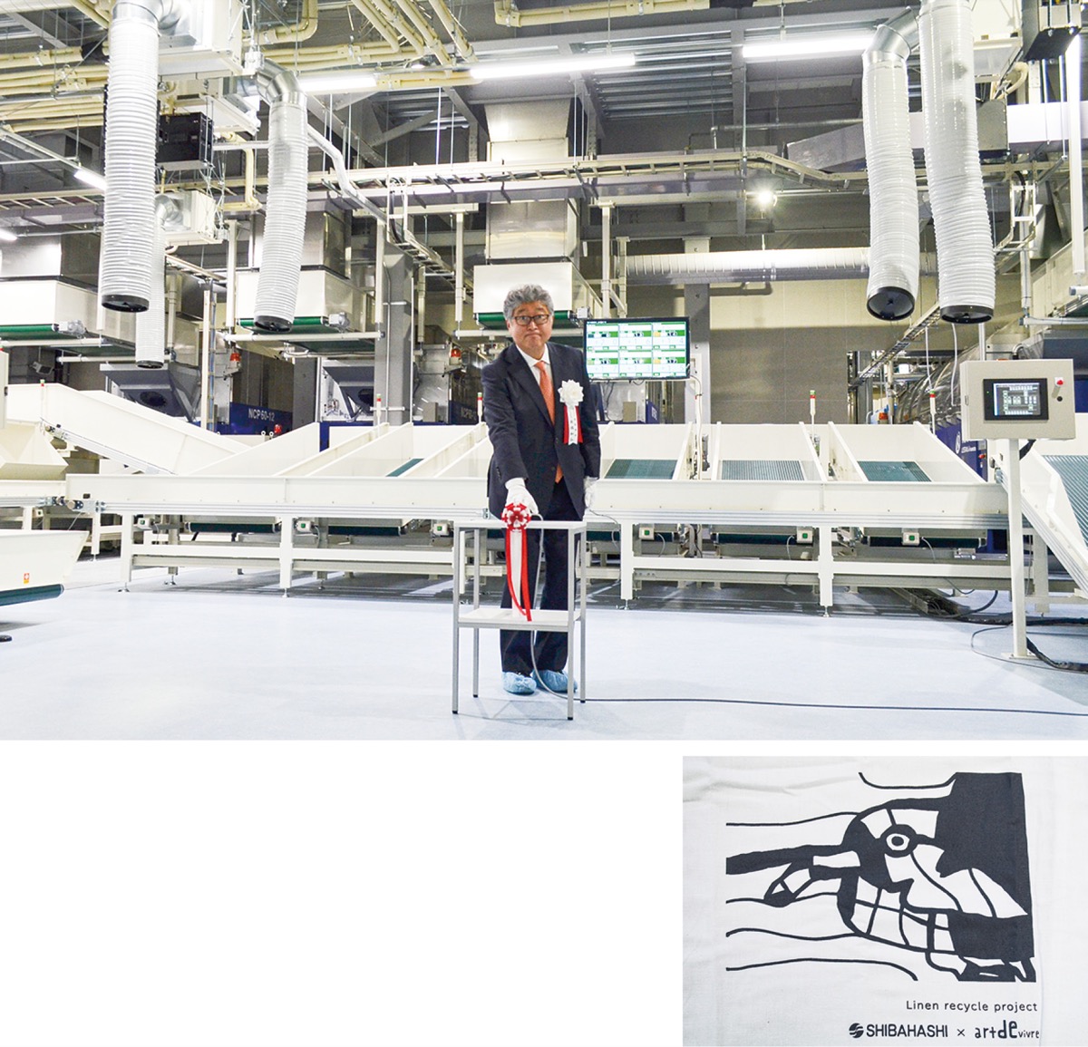 障害福祉サービス事業所アール・ド・ヴィーヴル(市内久野)との連携も深める。廃棄リネンを再利用したエコバッグの製作にあたり同事務所のアーティストのデザインを採用するほか、犬が描かれた作品を工場に展示する。