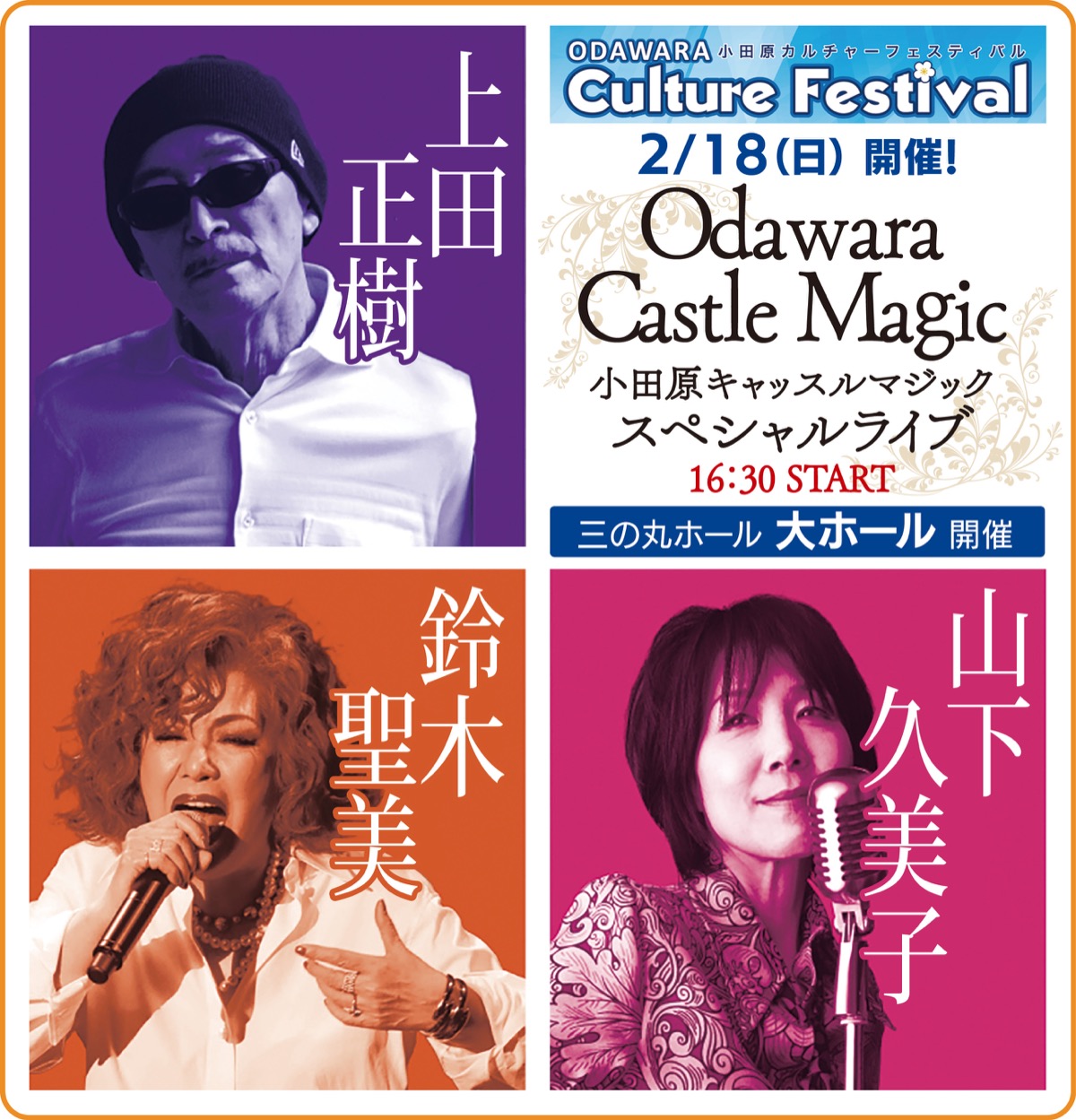 ポップス界で活躍する上田正樹、山下久美子、鈴木聖美という実力派3人が競演する「Odawara Castle Magic」が2月18日(日)、三の丸ホール大ホールで行われる。午後4時開場、4時30分開演。
