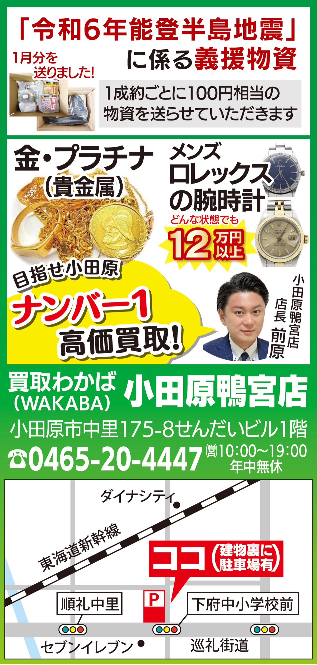 買取わかば小田原鴨宮店は現在、ブランド品の買い取りを強化している。特に、高級ブランド時計のロレックスは1月の価格改定で強気の値上げが行われ、今なら高値での買い取りが期待できる。前原店長は「超高騰中の今が狙い目です。もちろんですが、傷や汚れがあっても、付属品がなくても高価買取できます」と話す。また、シャネルやルイヴィトンなどのブランドバッグも買取強化中だ。「買取価格で小田原ナンバー1を目指します。どんな商材でもご相談ください」