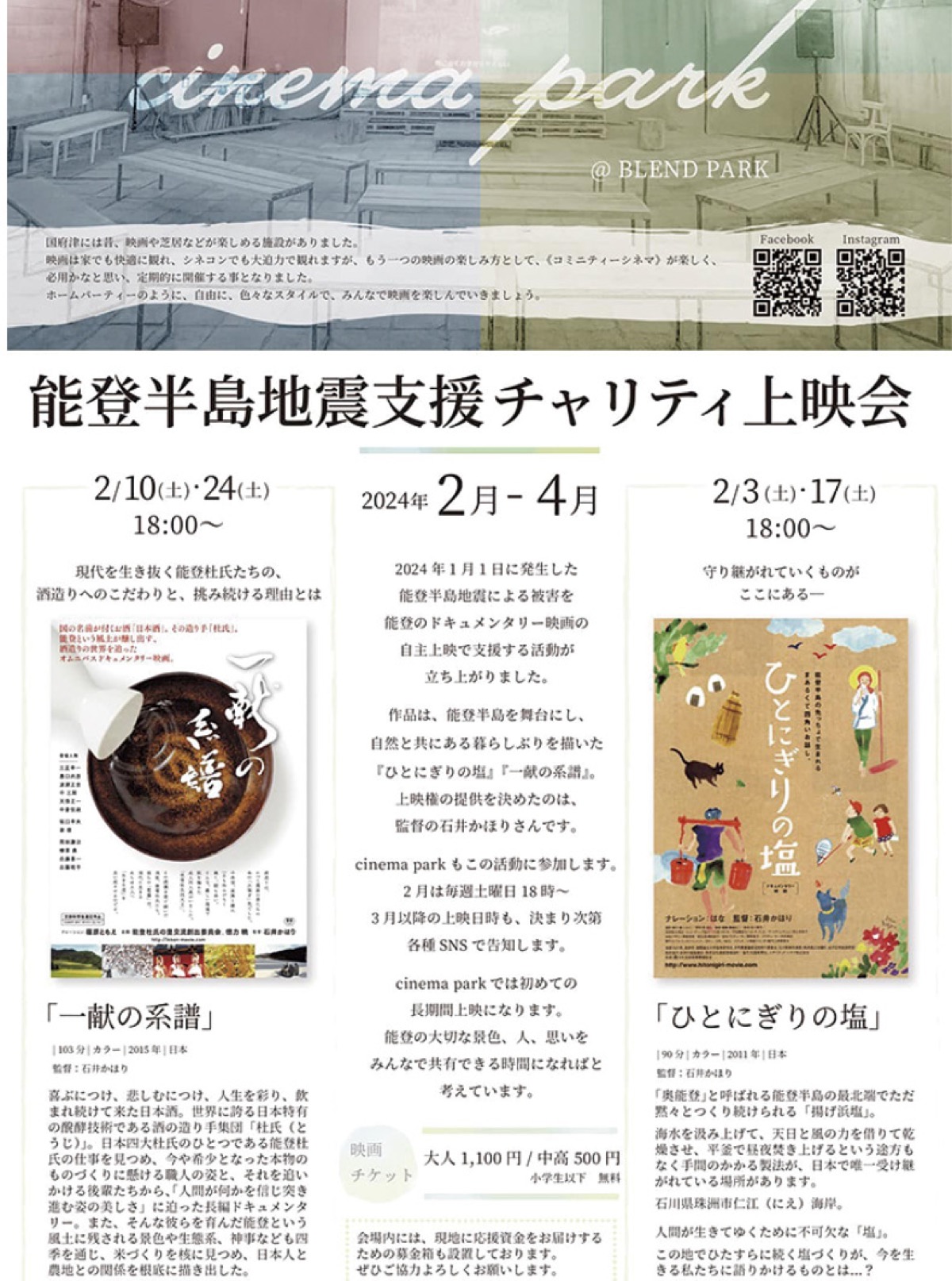 BLEND PARK(小田原市国府津2の6の17)で能登半島地震の支援チャリティ上映会が2月から毎週土曜日に開催されている。映画監督の石井かほりさんが始めたチャリティ上映の活動に「BLENDシリーズ」を手掛ける杉山大輔さんが参加。能登半島の地場産業に密着したドキュメンタリー映画『一献の系譜』を2月10日と24日、『ひとにぎりの塩』を17日に上映する。各日午後6時からで大人1100円、中高生500円、小学生無料、会場内には募金箱も設置されている。