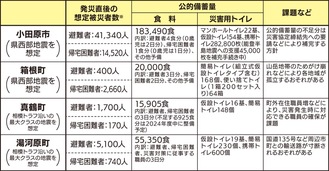 3町では避難者等に3日分(1日3食)を目安に食料を備蓄している。観光客の多い箱根町は帰宅困難者に関しては2日分。人口が多い小田原市は避難者4食分、帰宅困難者1食分で、市担当者は「不足分は災害協定先への要請などにより補完する方針」としている。
