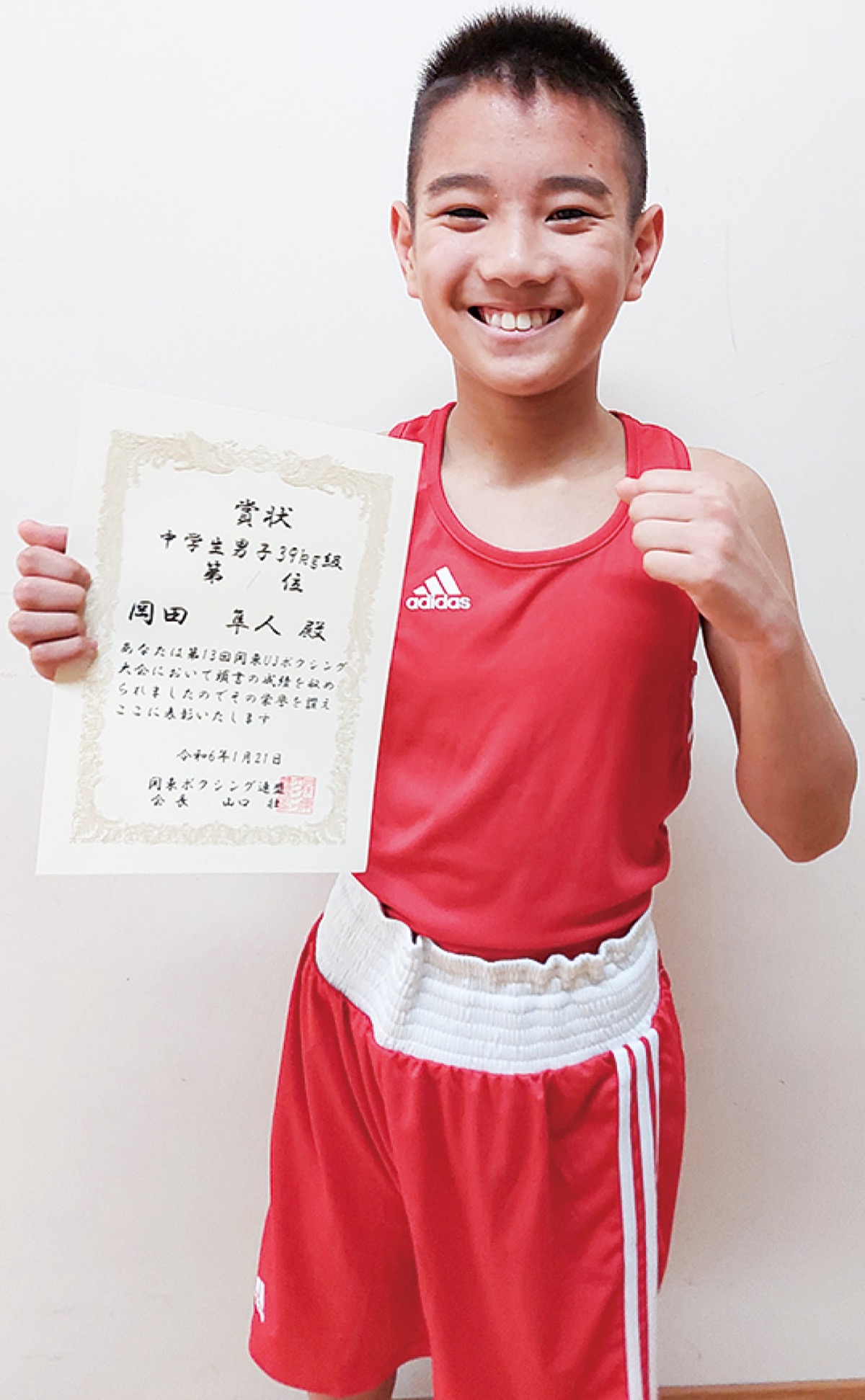 小田原市栄町のボクシング&フィットネスジム「M─flap」に通う岡田隼人さん(白鷗中・1年)が1月21日、第13回関東アンダージュニアボクシング大会の39kg級で優勝した。関東チャンピオンとして、3月28日(木)から31日(日)に岡山県で開催される全国大会への出場を決めた。