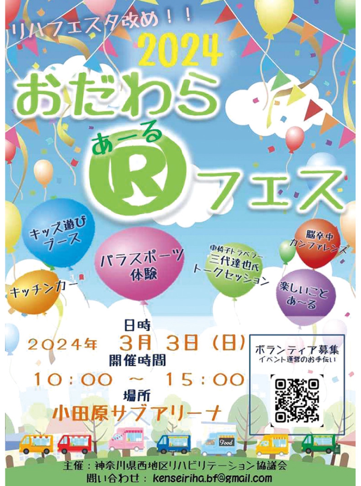 神奈川県西地域リハビリテーション協議会が3月3日(日)、小田原アリーナのサブアリーナで「おだわら(R)フェス」(旧リハフェスタ)を開催する。午前10時〜午後3時。ブラインドサッカーなどパラスポーツの体験や、脳卒中当事者の会による講演などを予定している。(問)同会【メール】kenseiriha.bf@gmail.com