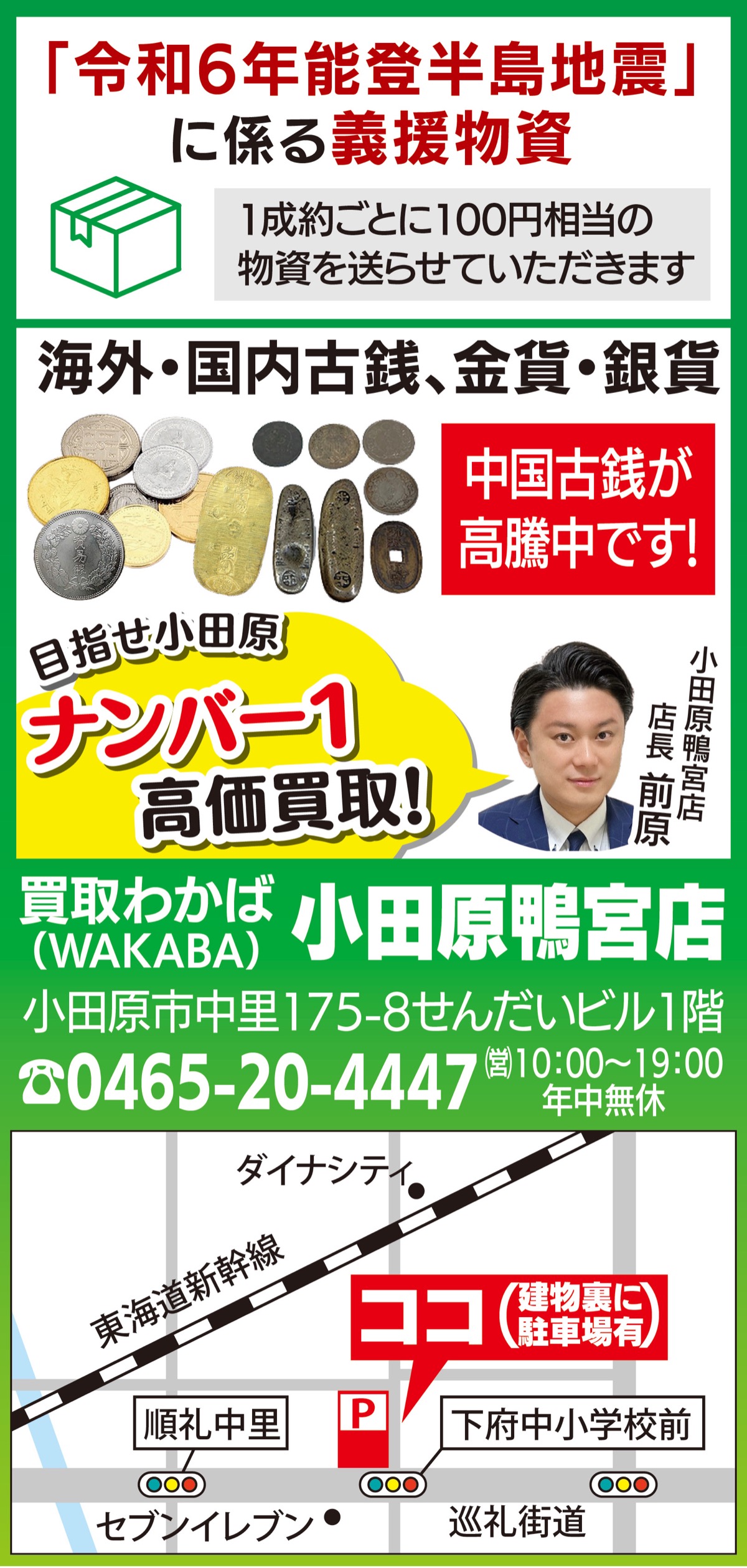 希少性の高い古銭は高値で売れる。しかし知識や経験がないと相場感が分からず、安値で取り引きされることも。買取わかば小田原鴨宮店の前原店長は「数十万円相当の古銭もあります。一枚づつ本気査定して、それを見逃しません。量があると取り引きしやすいので、まとめてお持ち込みください」と話す。どんな国のものでも大歓迎。特に中国古銭は高価買取の期待ができる。金貨・銀貨も買取中だ。