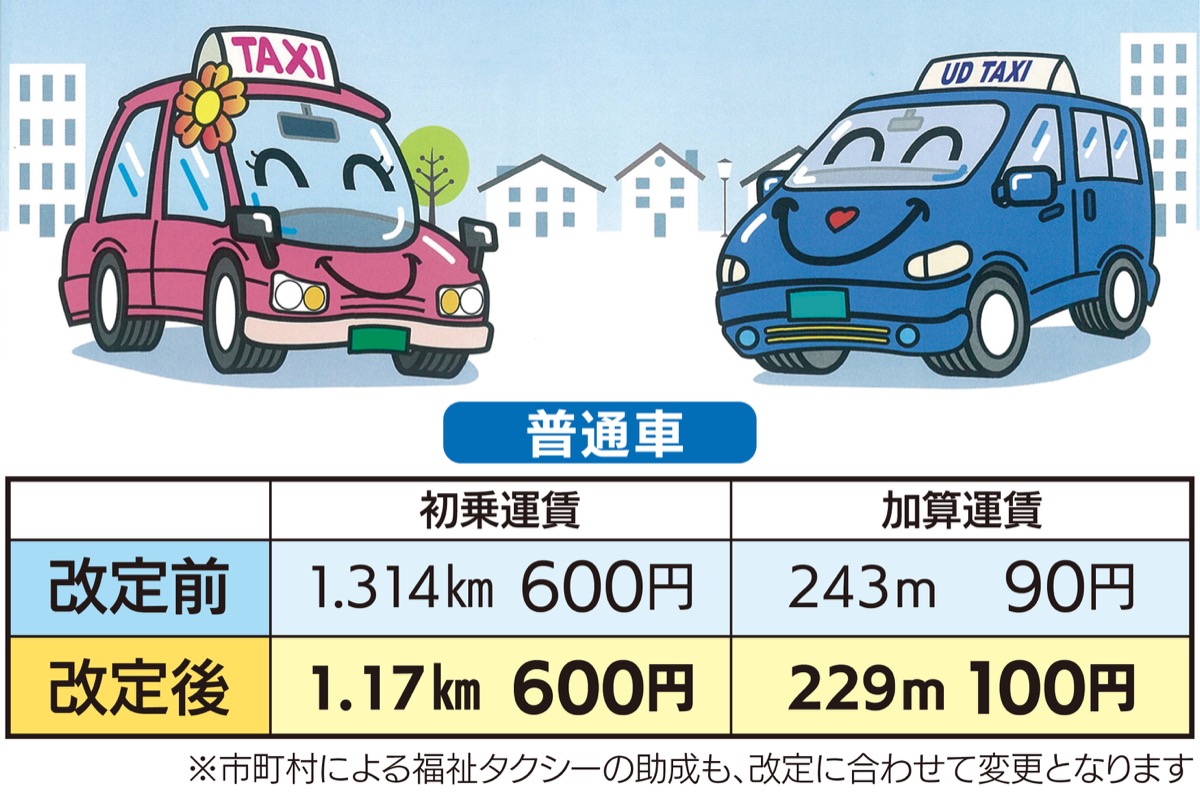 初乗運賃は現在の「1・314kmまで600円」が、改定後は「1・17kmまで600円」となる。また、初乗以降の加算運賃も現在の「243mごとに90円」から、改定後には「229mごとに100円」となる。