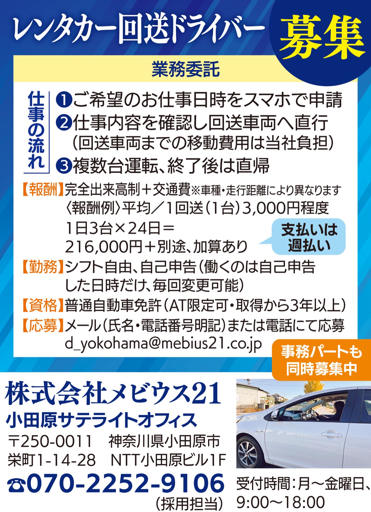 レンタカー回送業の(株)メビウス21では、小田原サテライトオフィスの開設に伴い、レンタカーの回収ドライバーを募集している。