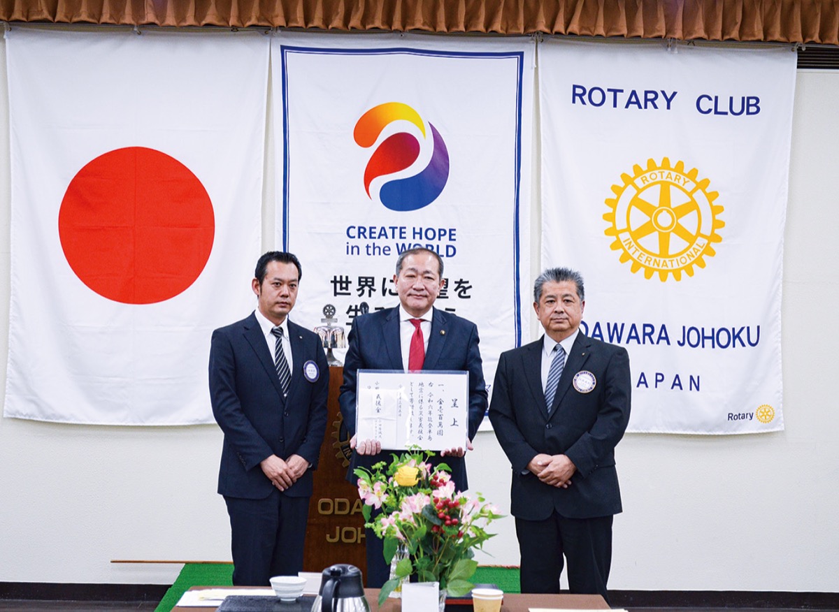 小田原城北ロータリークラブが3月5日、能登半島地震に対する義援金の贈呈式を行った。守屋輝彦小田原市長に贈呈した義援金100万円は赤十字社を通して被災地に届けられる。荻野善明会長は「既に支援金を寄付をしていたが、今回は被災地に直接届く義援金を送ることにした。一日でも早い復興に役立てていただければ。これらの活動が寄付意識の醸成や、防災意識の向上につながれば」と話した。