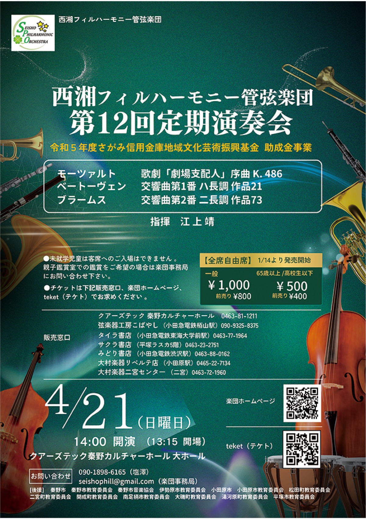 西湘フィルハーモニー管弦楽団の「第12回定期演奏会」が4月21日(日)、クアーズテック秦野カルチャーホールで行われる。午後1時15分開場、2時開演。