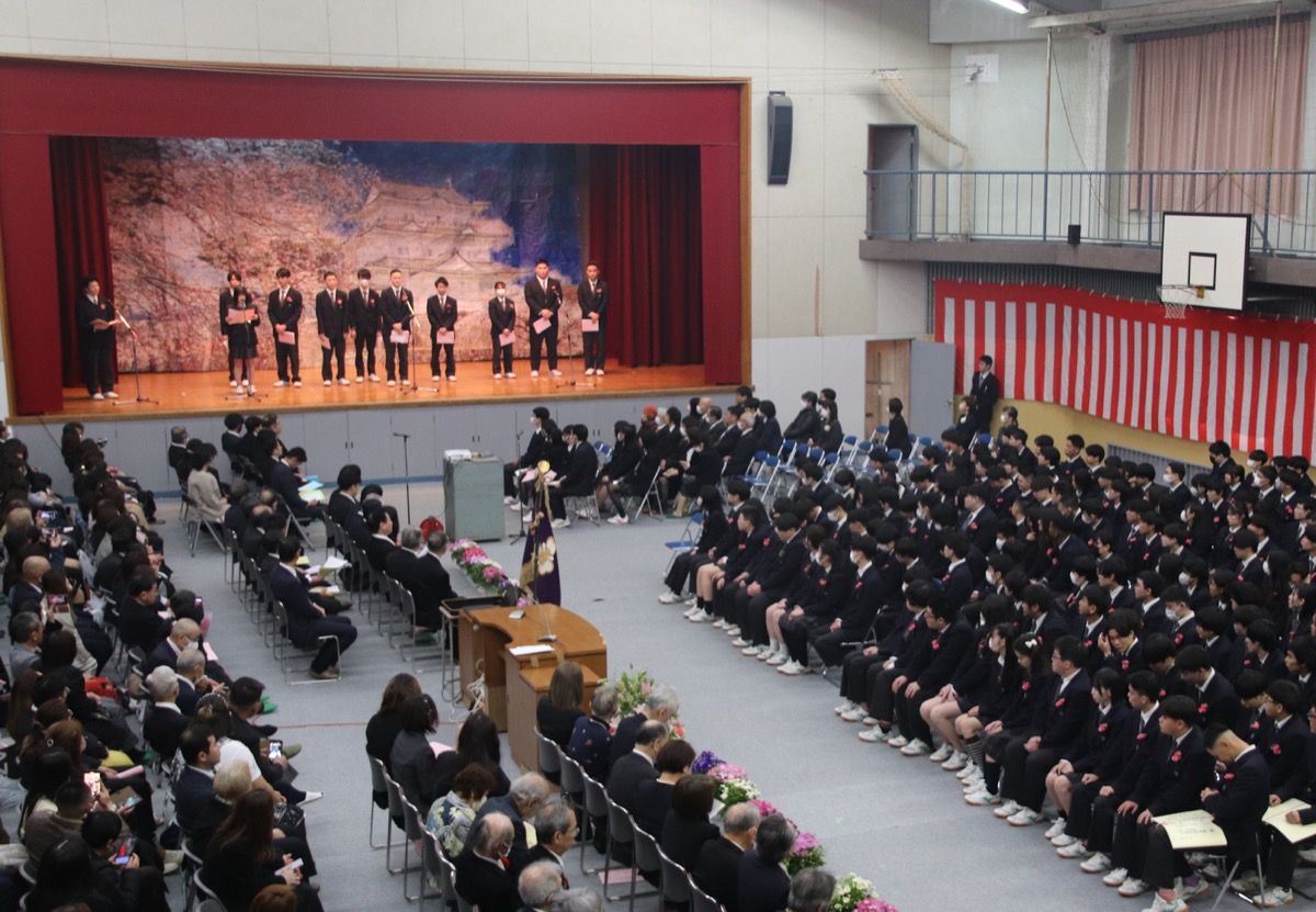 旭丘高等学校(水野浩理事長・学校長)では228人が晴れの日を迎えた。桜満開の小田原城の絵を背景に、卒業生代表が学園生活を振り返った。生徒会総務・執行部で会長を務めた奥津大雅さんは「この学校で出会ったすべての愛すべき人に感謝したい」と述べた。