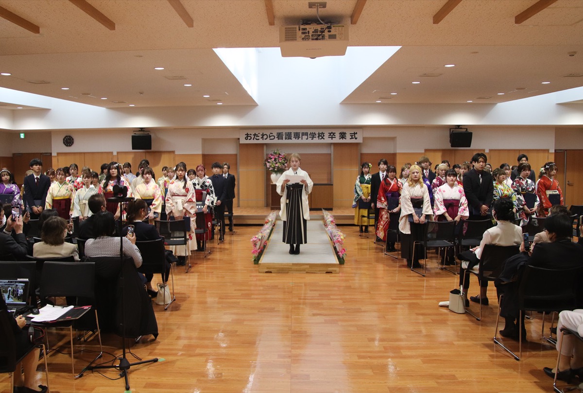 59人が新たな巣立ちを迎えたおだわら看護専門学校(横田俊一郎学校長)。4年ぶりに来賓を招いたにぎやかな式となった。卒業生が保護者や教員に向かい、感謝を伝える演出では、涙を流す場面も。卒業生代表の北上誉人さんは「この3年間はこれからの人生で大きな糧になる」と話した。