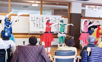 今月はひなまつりをテーマに実施し、利用者52人が参加。全員で『うれしいひなまつり』を歌ったほか、ラジオ体操で体を動かした。また職員がリコーダーやオカリナで歌謡曲を披露すると、懐かしそうに歌を口ずさむ姿、戦隊ヒーローの登場=写真=に歓声が上がるなど、会場は終始笑顔であふれていた。80代の女性は「ここに来るのが一番の楽しみ」とうれしそうに話した。