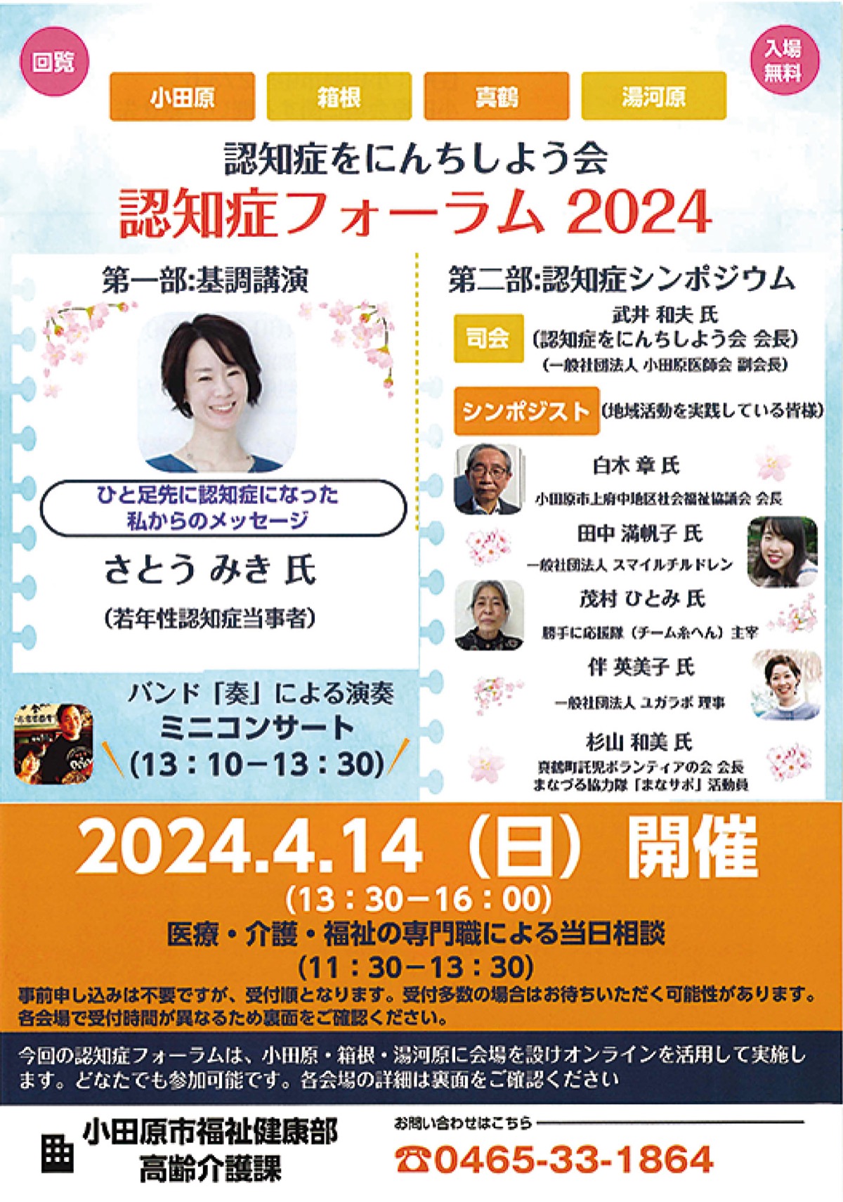 ▷ミニコンサート/午後1時10分〜1時30分(バンド「奏」)▷第一部基調講演/1時30分〜2時20分「ひと足先に認知症になった私からのメッセージ」さとうみき氏(若年性認知症当事者)※小田原会場で講演、箱根会場と真鶴・湯河原会場で映像を配信▷第二部認知症シンポジウム/2時40分〜3時40分:司会・武井和夫氏(認知症をにんちしよう会会長・小田原医師会副会長)、パネリスト・白木章氏(小田原会場/小田原市上府中地区社会福祉協議会会長)、田中満帆子氏(小田原会場/一般社団法人スマイルチルドレン)、茂村ひとみ氏(箱根会場/勝手に応縁隊「チーム糸へん」主宰)、杉山和美氏(湯河原・真鶴会場/真鶴町託児ボランティアの会会長・まなづる協力隊「まなサポ」活動員)、伴英美子氏(湯河原・真鶴会場/一般社団法人ユガラボ理事)