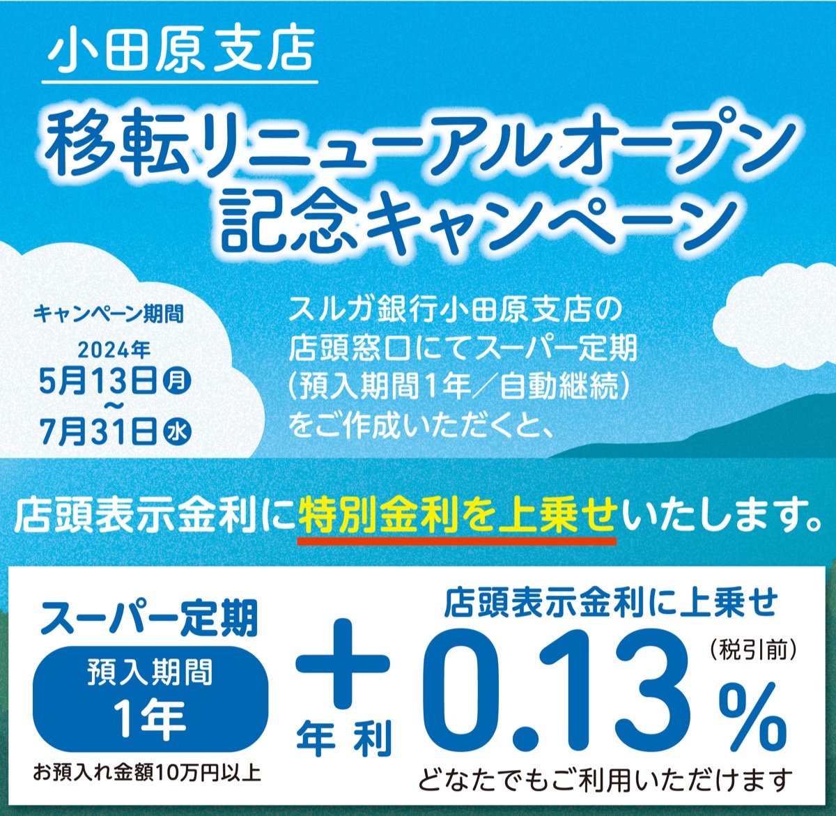 今回は新たな資金でスーパー定期(1年)を申し込むと、店頭表示金利に年利0・13%の特別金利を上乗せ。将来の資産形成や退職金の預け先など、この機会に新しいスルガ銀行小田原支店を賢く利用してみては。