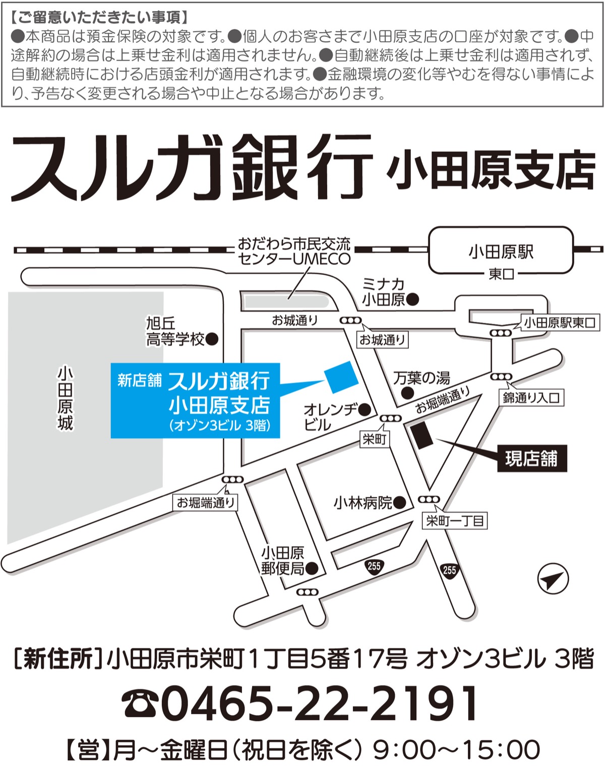 スルガ銀行小田原支店が5月13日(月)に移転し、リニューアルオープンする。移転先は小田原駅そばの公証役場隣にあるオゾン3ビル3階。