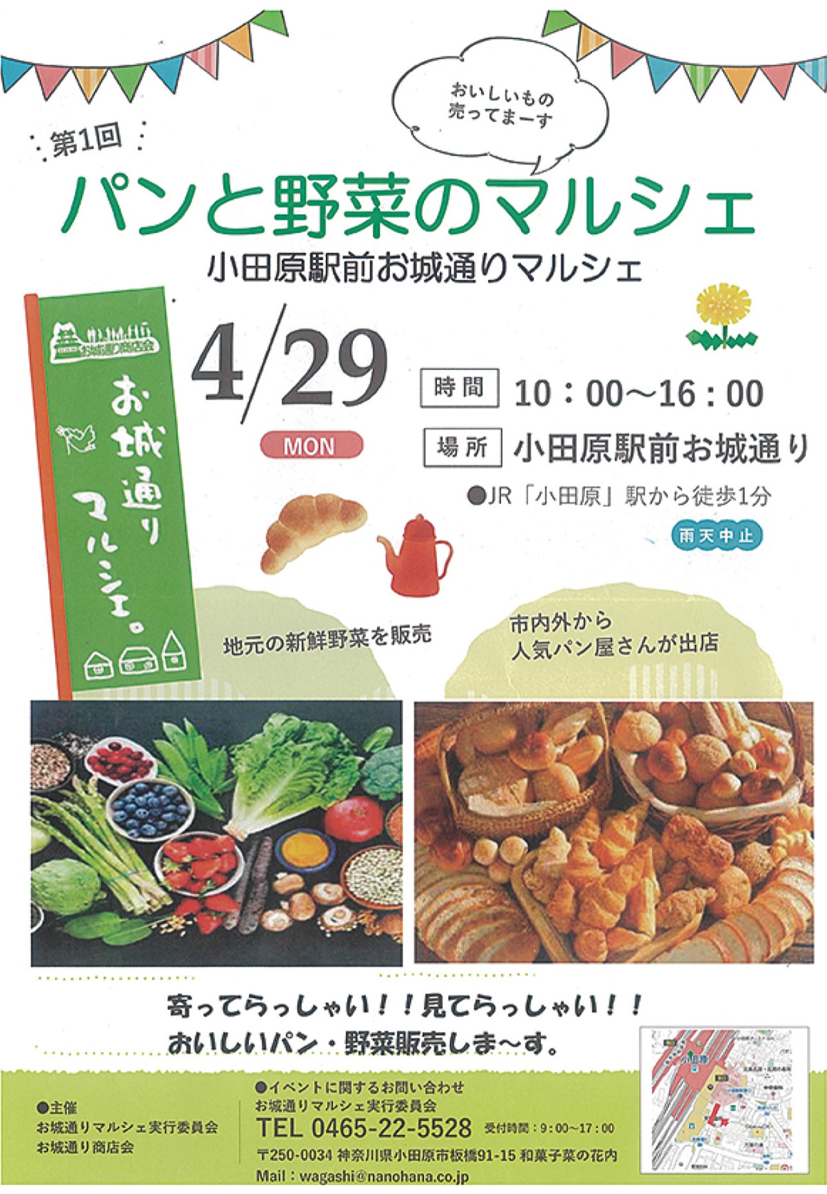 小田原駅東口の小田原駅前お城通りで4月29日(月)、「第1回パンと野菜のマルシェ」が行われる。