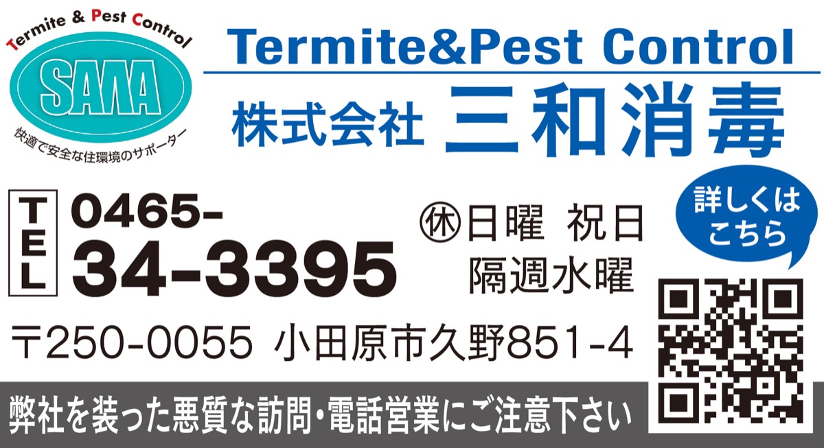 三和消毒は1979年に創業し、小田原を中心にシロアリ・害虫・害獣対策を行っている専門業者。社員のほとんどがシロアリ防除士の有資格者で豊富な経験と知識をいかし丁寧な説明と安心価格で信頼を得ている。