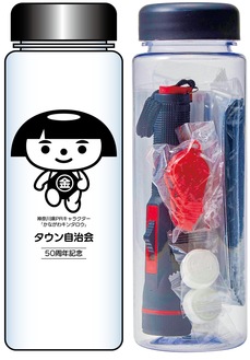 タウンニュース社では、災害に役立つものがセットになった「防災ボトル」に神奈川県PRキャラクター「かながわキンタロウ」のイラストと希望する団体名などを印刷するオリジナル品の取り扱いを始めた。