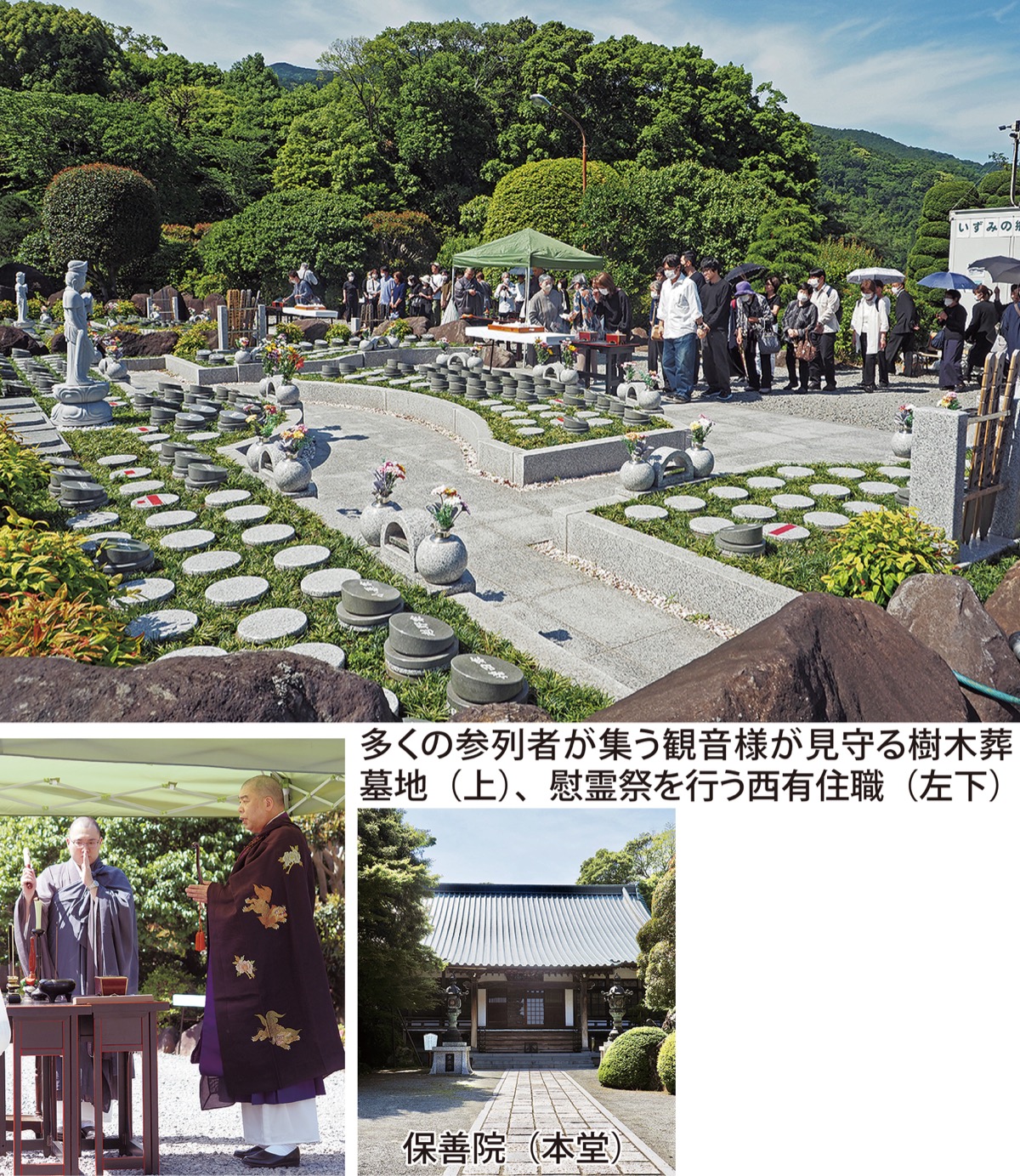 湯河原町隣の熱海市泉地区にある創建500年以上の由緒ある保善院の境内にある「いずみの郷ゆがわら樹木葬墓地」で5月18日、観音慰霊祭が開催され、120人以上が参列した。