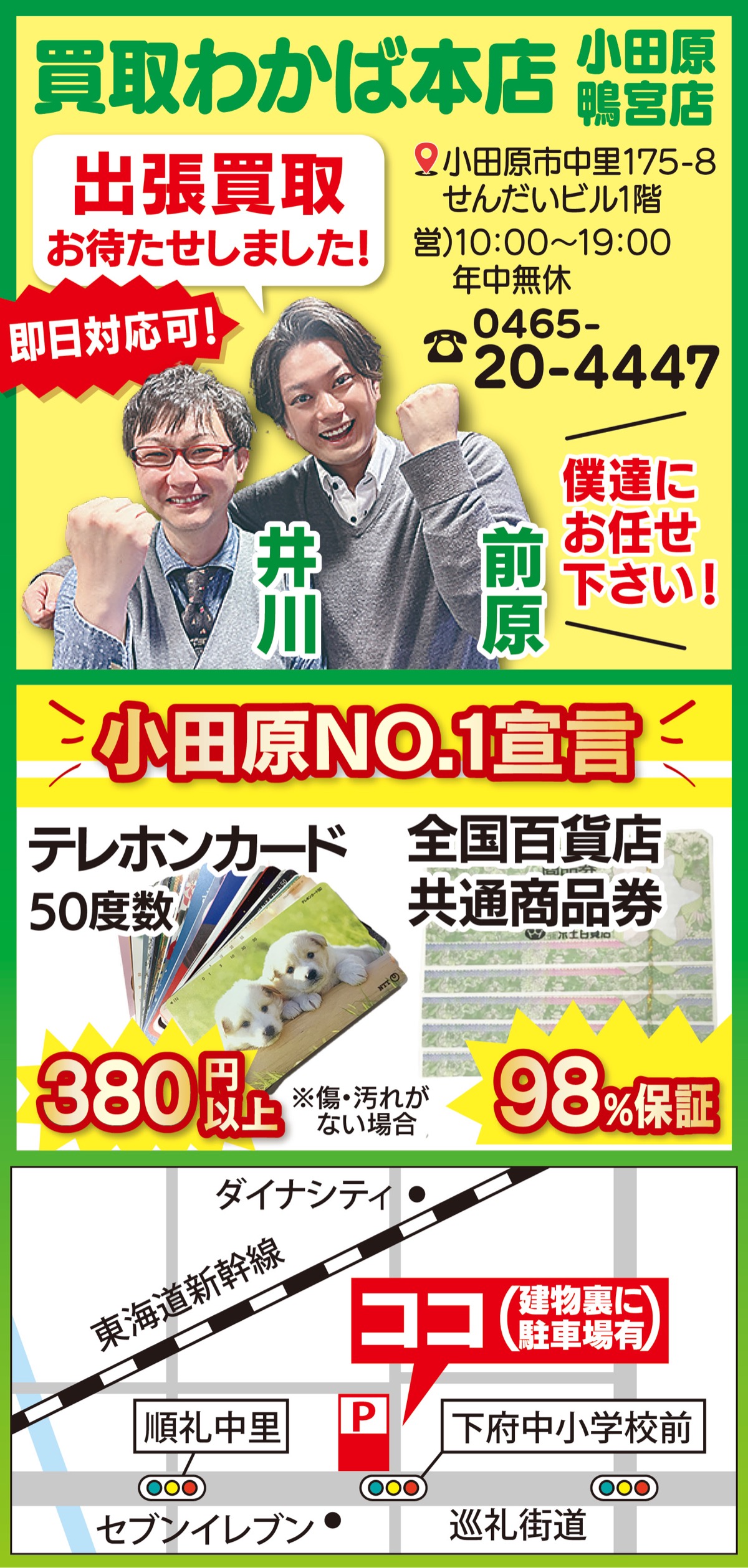 「不要品をどこで売るかお困りの皆さん、相見積をしたらぼくたちの買取金額が高いことが一目瞭然です」と買取わかば本店小田原鴨宮店の前原店長は自信を持って話す。「例えばテレカや商品券など、ぼくたちが小田原の買取相場を引き上げてきました。最近高騰が著しい金やプラチナもぜひお任せください。後々後悔させない金額で買い取らせて頂きます」。出張買取即日対応可。気軽に相談しては。