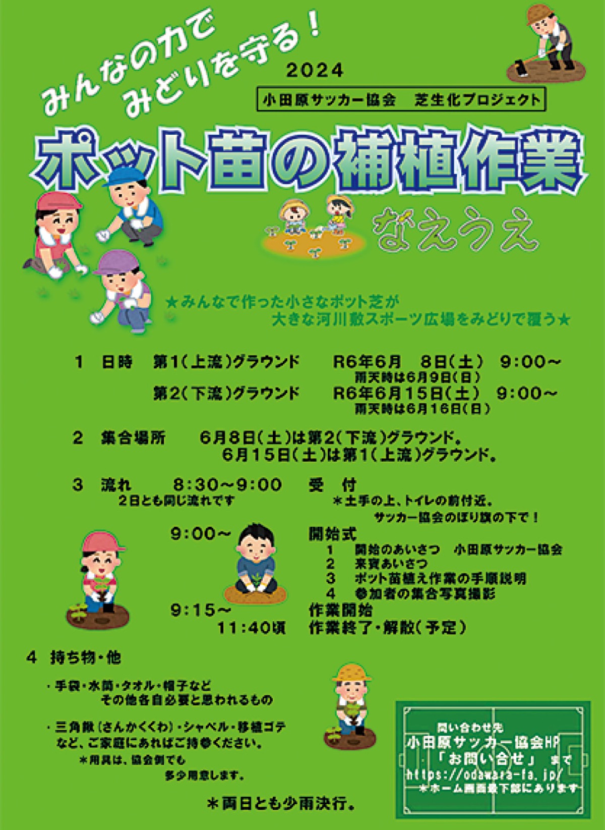 小田原サッカー協会が芝生化プロジェクトの一環として、6月8日(土)、15日(土)にポット苗の捕植作業を酒匂川スポーツ広場のサッカー場で開催する。午前9時から11時40分頃終了(少雨決行)。雨天時は翌日に実施。