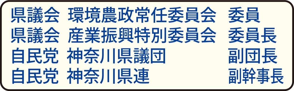 厳しい3期目の県議選を、皆様のあたたかな、そして強力なご支援をいただき勝利して早や1年余。当選当初より、「県議会防災警察常任委員長」、「自民党県議団副団長」、「自民党神奈川県連副幹事長」等に就任、県西地域や地元小田原市の”安全で安心して暮らせる地域づくり”に懸命に取り組む日々でした。