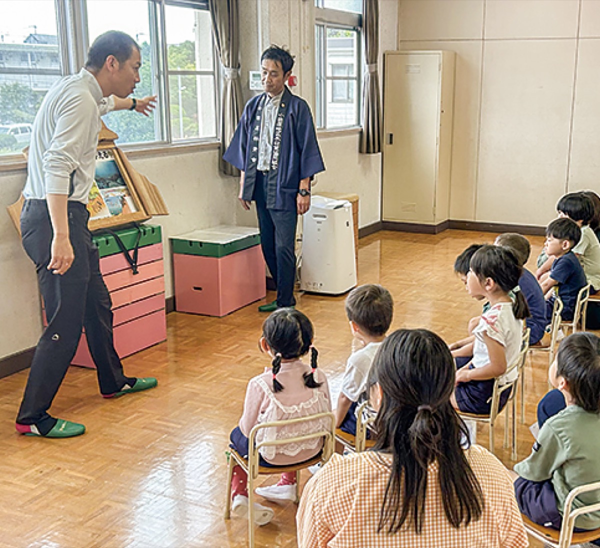 後半は小田原市森林組合と小田原地区木材業協同組合が、間伐材の活用が森を守ることにつながることを伝える紙芝居を読み聞かせたほか、積み木などで遊ぶ時間を設けた。園児の一人は「いいにおいがする」と木材のボールを抱えて、笑顔をみせていた。