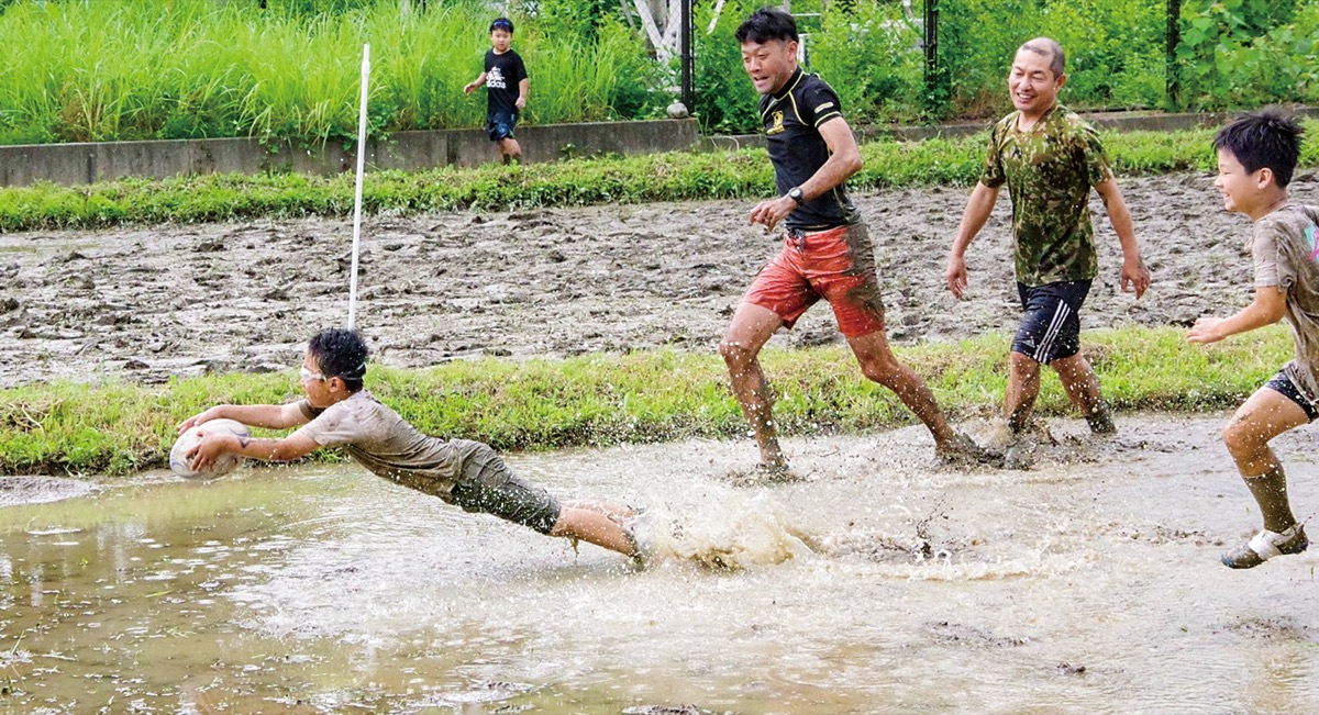 田植え前の水田を耕す目的で行われている同企画。この日は小田原ラグビースクールや平塚市ラグビースクールの生徒に加え、県西地域で児童育成イベントに取り組むNPO法人こころみの呼び掛けで参加した児童ら約100人が参加した。