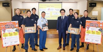 県西2市5町を管轄する小田原市消防本部の職員が着用する防火衣に有料広告スペースを設け、広告料収入を消防活動に還元する「みんなで消防士さんを応援しよう!プロジェクト」の協賛品贈呈式が6月21日に、小田原市消防本部で開かれた=写真。
