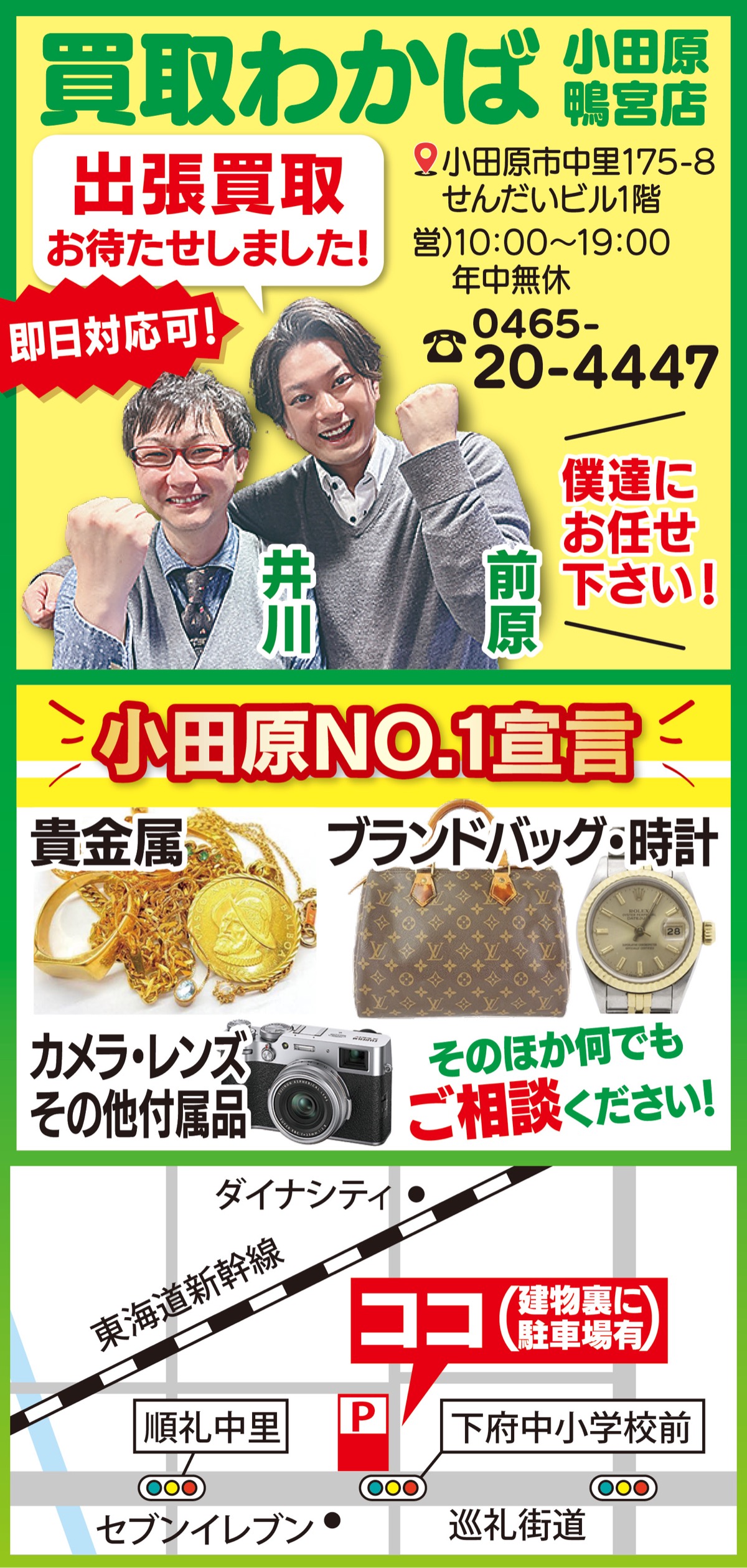 遺品整理や生前整理で不要品をまとめても処分にはお金と労力が要る。その中から現金化できる物を一括で調べてほしい人は、買取歴10年以上のプロ鑑定士が常駐する買取わかば小田原鴨宮店に相談しては。同店は出張買取も対応中で自宅での査定も可能。貴金属やブランド品はもちろん、骨董品やカメラなど何でも査定対象。井川店長は「大切な物だからこそ、捨てたり安く売ったりしないで下さい」と話す。